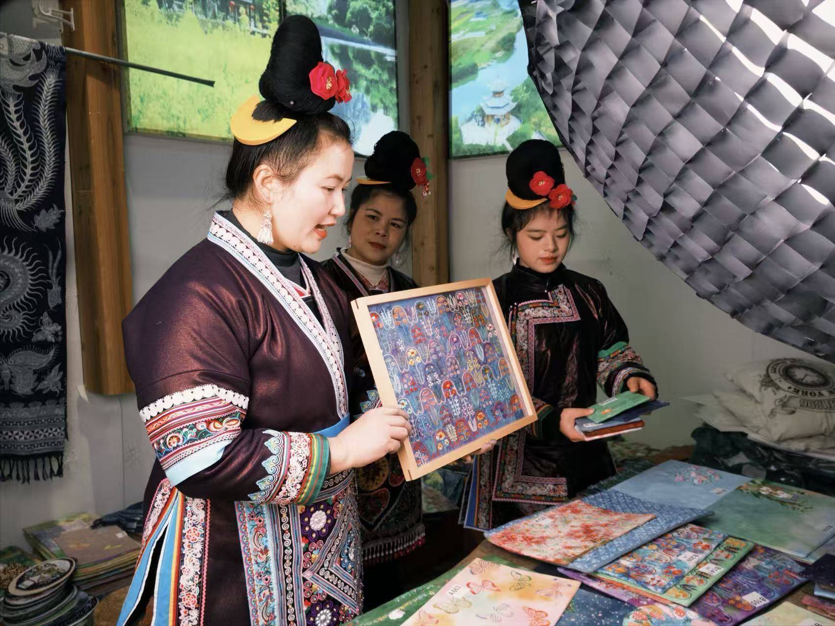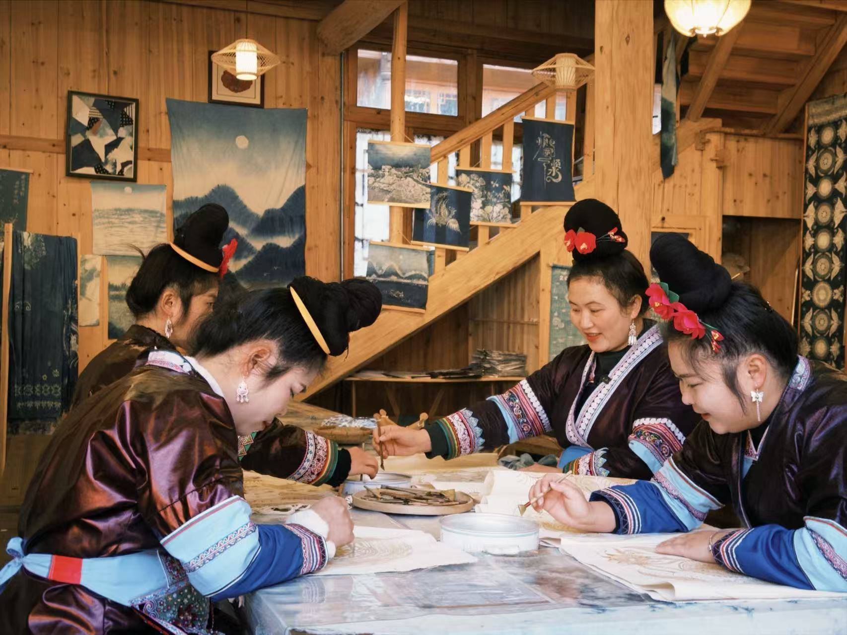 互助社内的非遗工坊,不同浅深的蓝色布料缔造成的东谈主工造景,成了侗寨游览的知名打卡点。不少番邦旅客前来不雅赏非遗工艺,选购互助社制作的非遗文创居品。