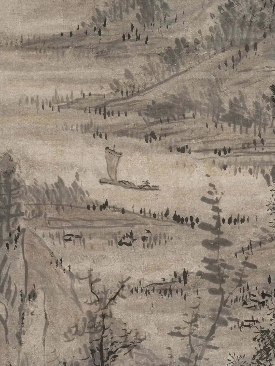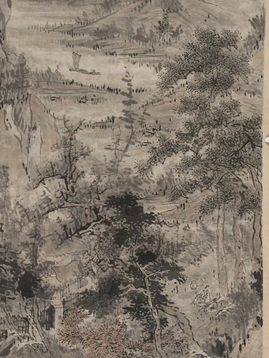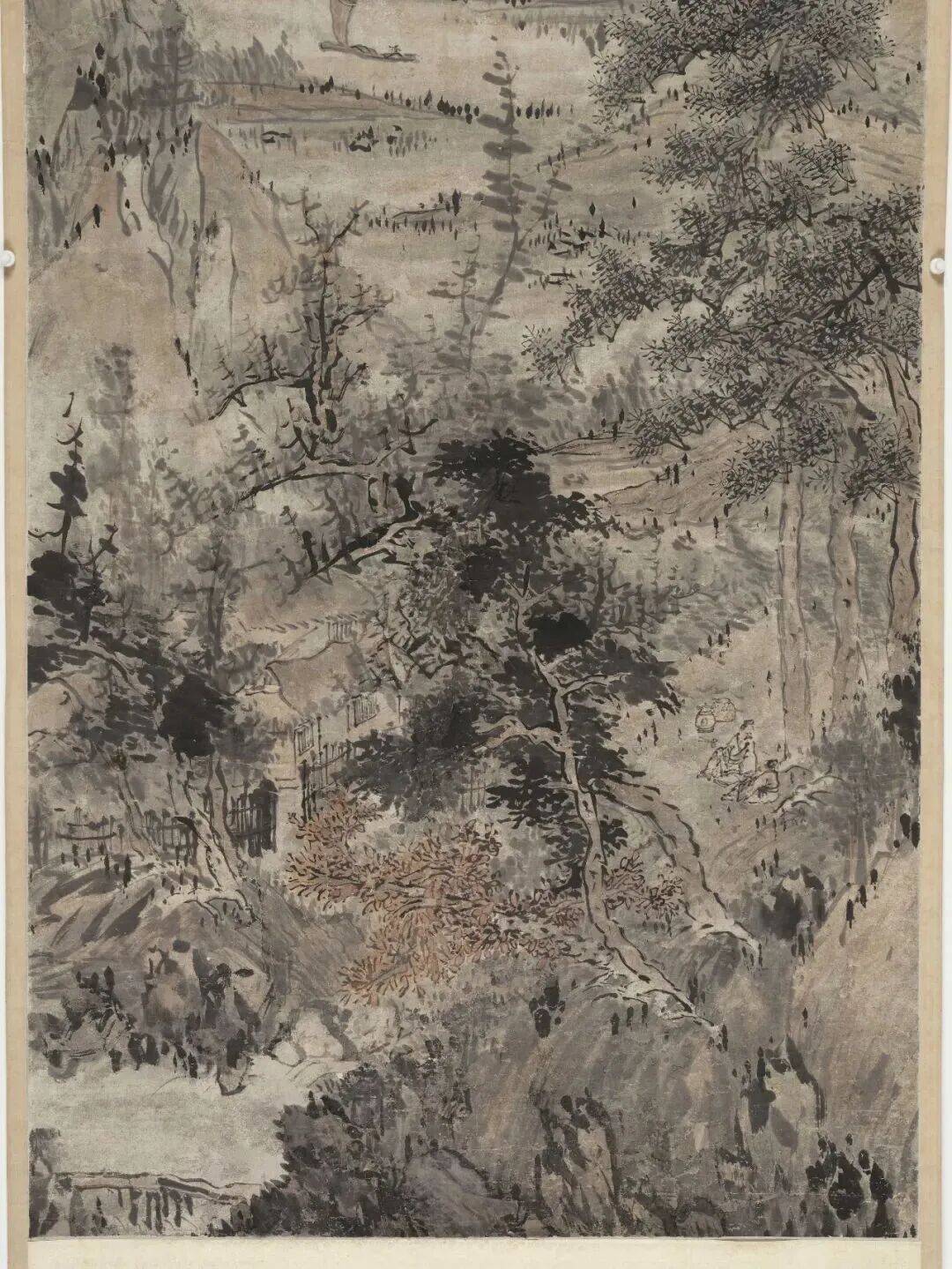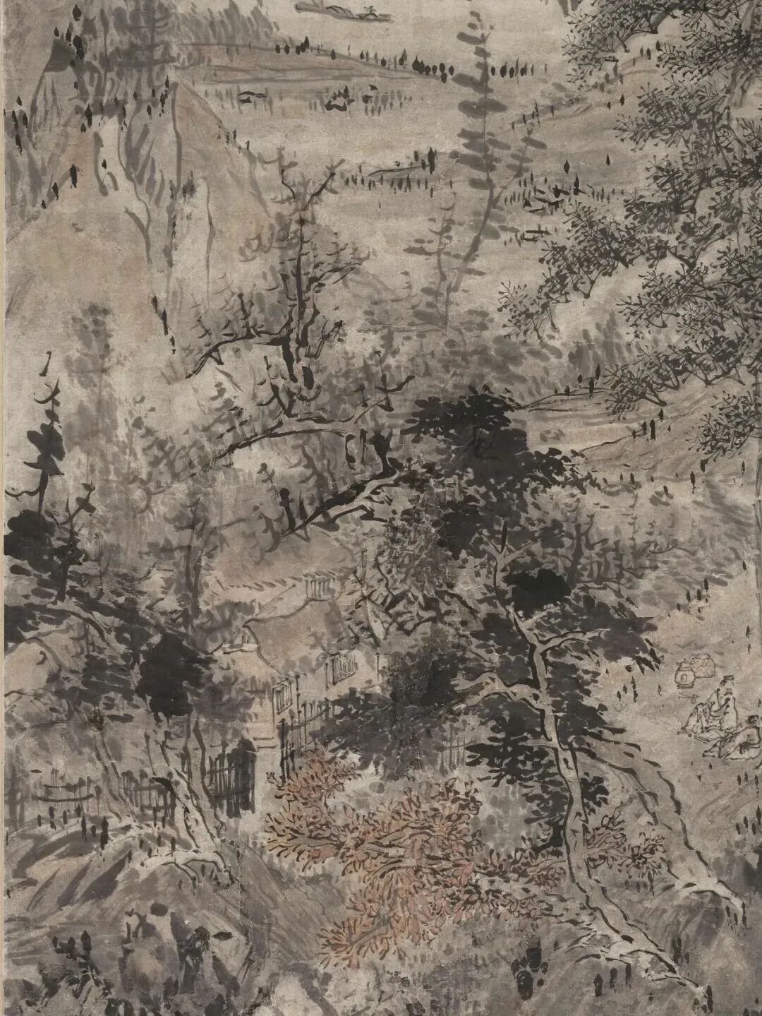 布景里的青山,用淡墨轻轻一抹,就勾画出了档次感;近处的树木,枝桠闹热,用笔浓淡相间,既有盼愿又不显杂沓。这山水,就像老头煮茶的神志——不慌不忙,镇定自得。