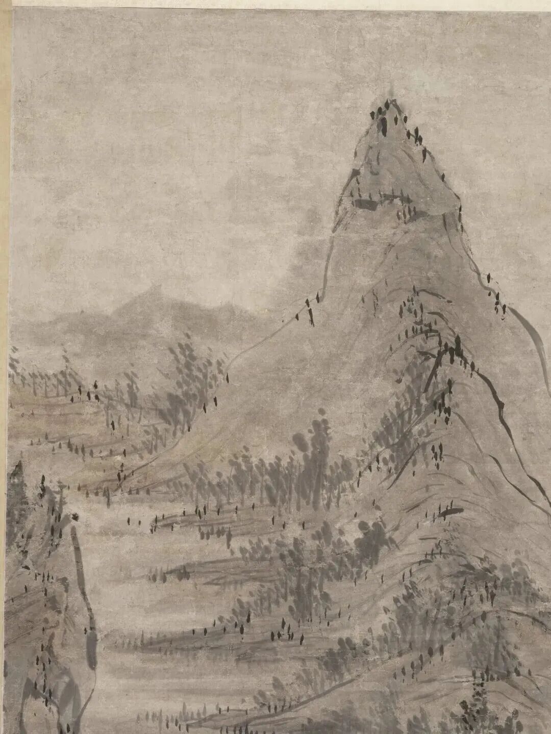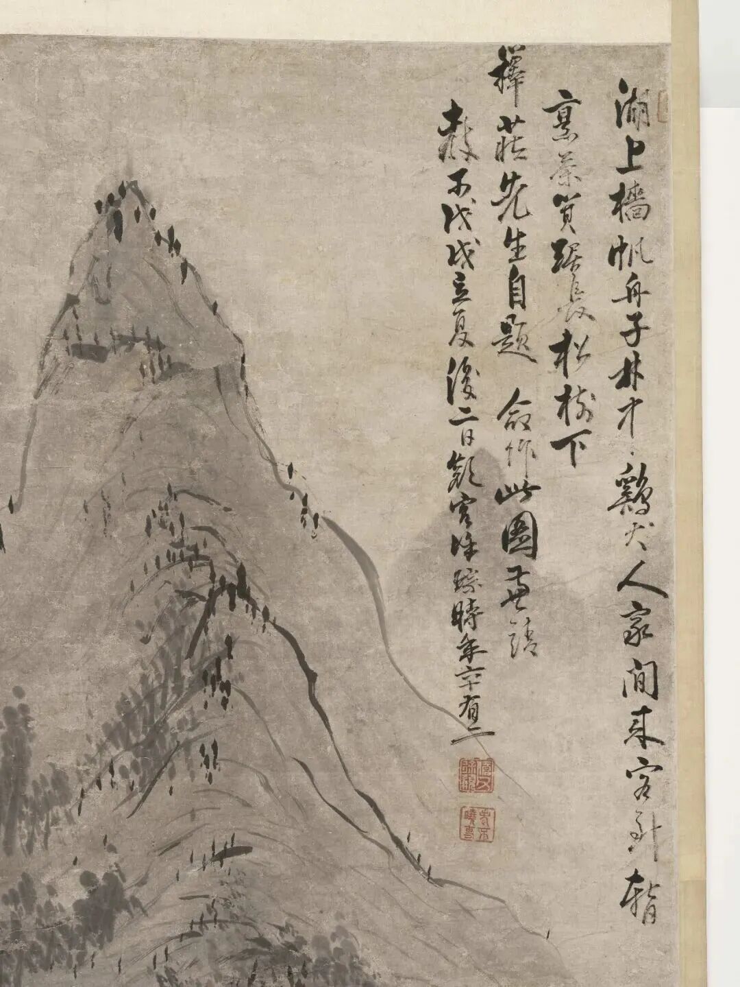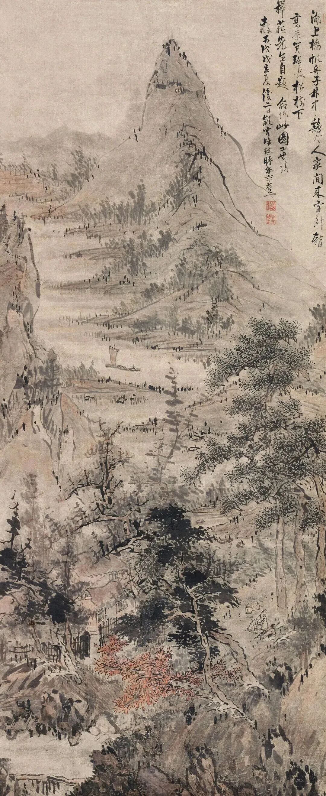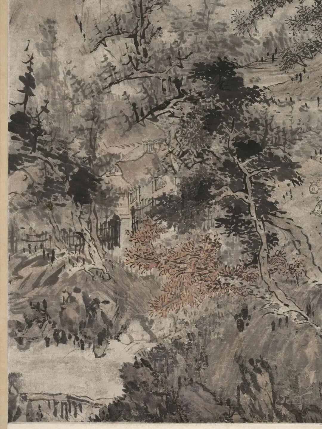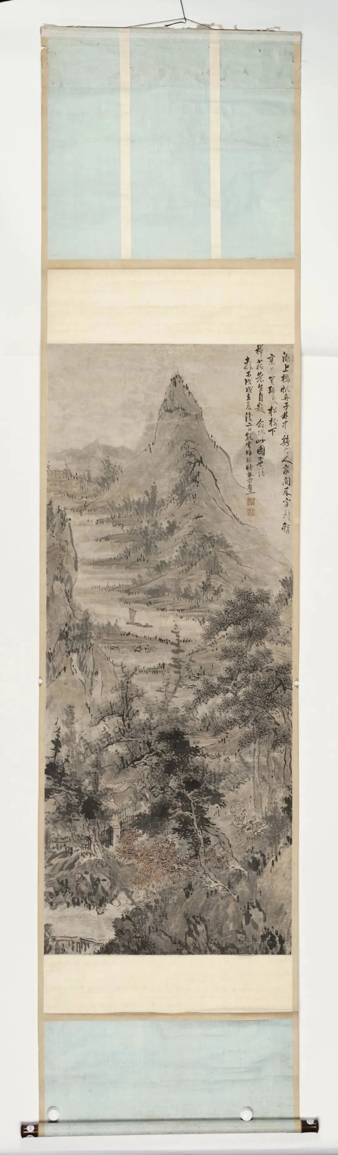 布景里的青山,用淡墨轻轻一抹,就勾画出了档次感;近处的树木,枝桠闹热,用笔浓淡相间,既有盼愿又不显杂沓。这山水,就像老头煮茶的神志——不慌不忙,镇定自得。