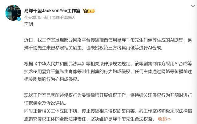 据此前媒体报说念,近日多位网友发帖,一短剧平台上多部AI短剧在未经授权的情况下,使用AI合成技巧盗用艺东说念主易烊千玺的肖像及声息。